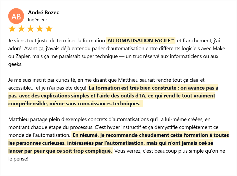 👉 À la fin de la formation, tu repartiras avec ta première automatisation prête à l’emploi, et toutes les clés pour continuer à libérer ton temps chaque semaine!