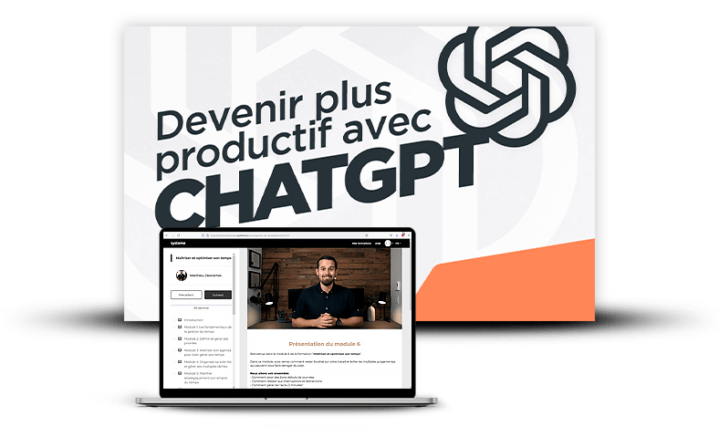 Une formation en ligne qui t'explique comment utiliser ChatGPT à son plein potentiel dans ton travail et ta vie perso afin de gagner du temps, réduire ta charge et être plus efficace.