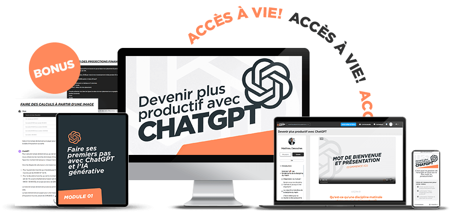 La formation comprend plus de 10 heures de contenu en français sur ChatGPT. En achetant cette formation, tu obtiens un accès illimité à toutes les vidéos du cours. Les vidéos sont disponibles sur un espace de formation sécurisé qui est accessible sur tous tes appareils: téléphone, tablette et ordinateur.