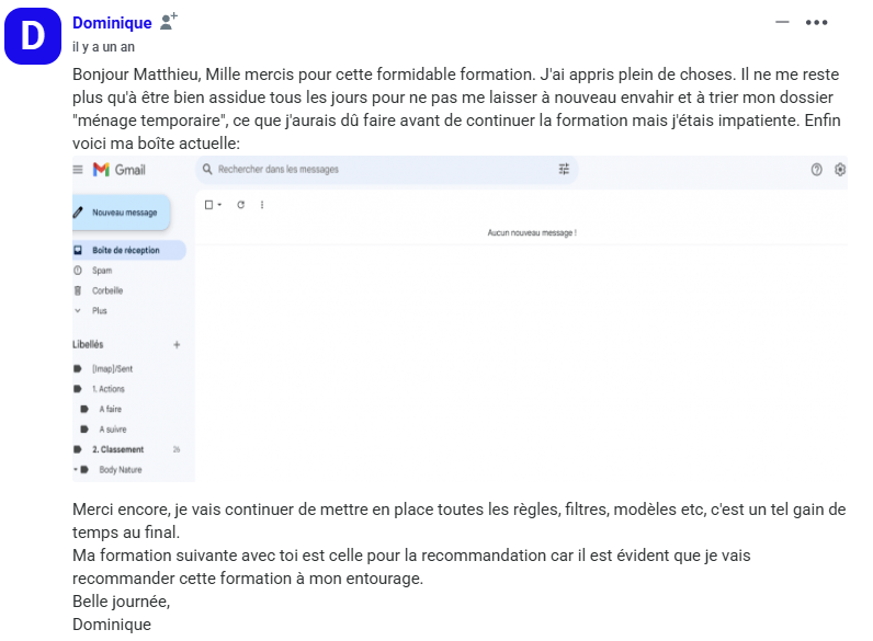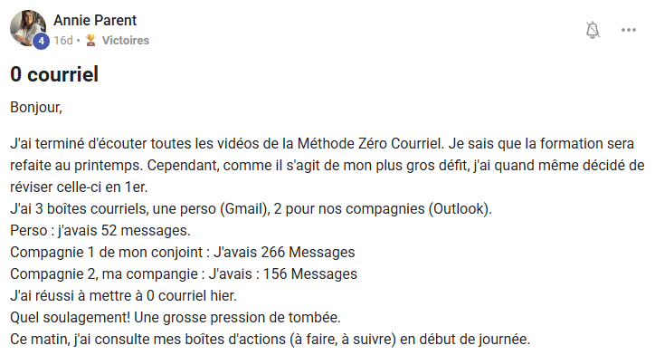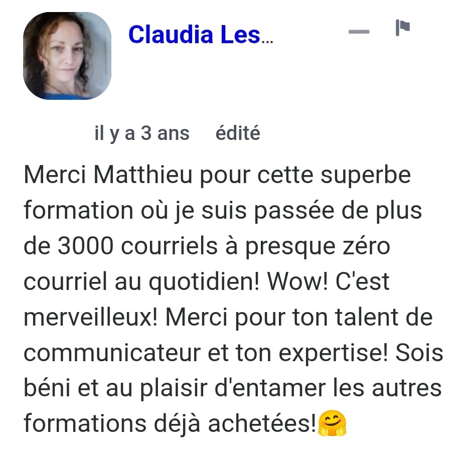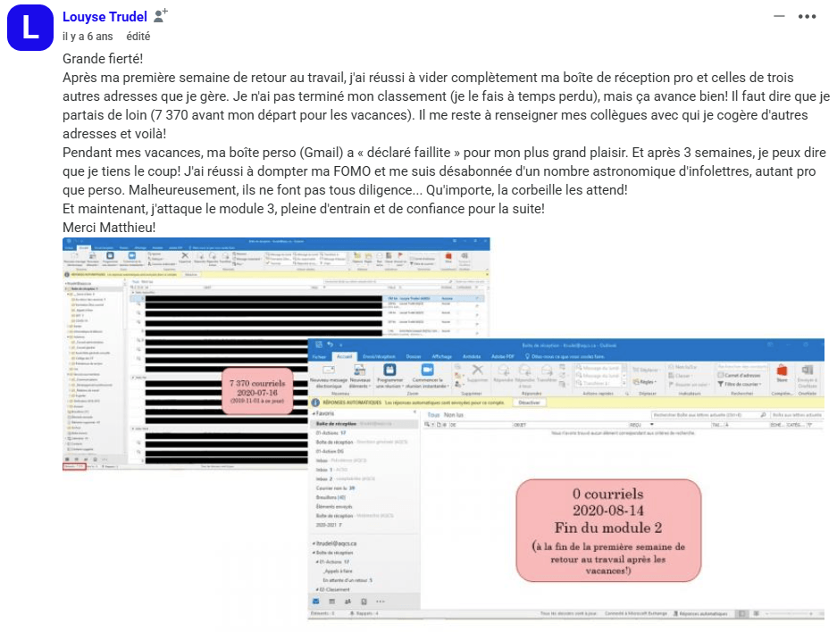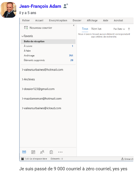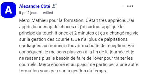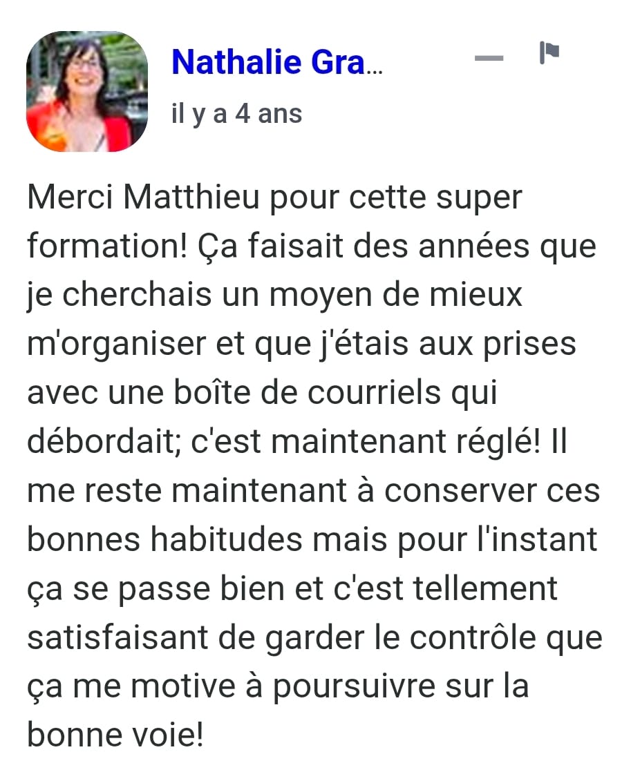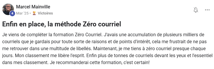 « Le jour où j’ai compris que l’inbox n’était pas un lieu de stockage, et que j’ai commencé à appliquer la méthode Zéro Courriel, tout a changé. Je suis passé de 2000+ courriels… à 0. Et surtout : j’ai repris le contrôle ».