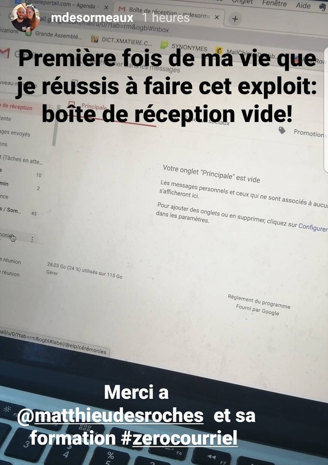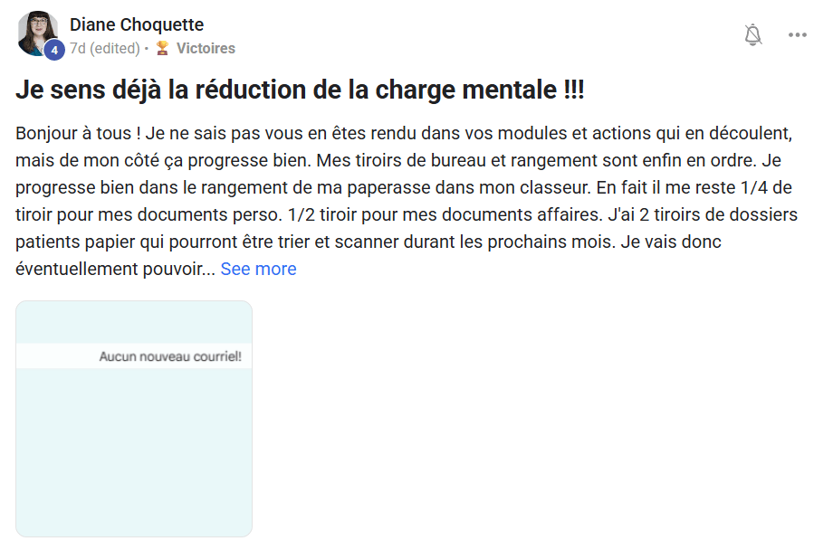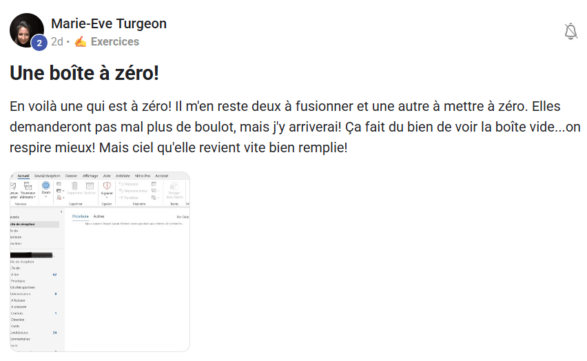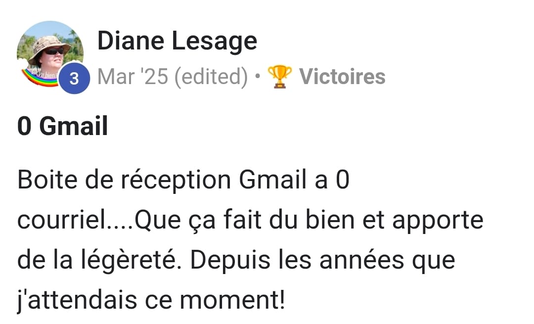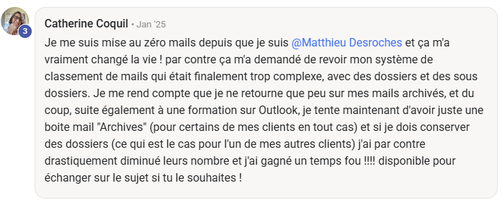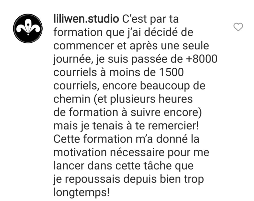 « Le jour où j’ai compris que l’inbox n’était pas un lieu de stockage, et que j’ai commencé à appliquer la méthode Zéro Courriel, tout a changé. Je suis passé de 2000+ courriels… à 0. Et surtout : j’ai repris le contrôle ».