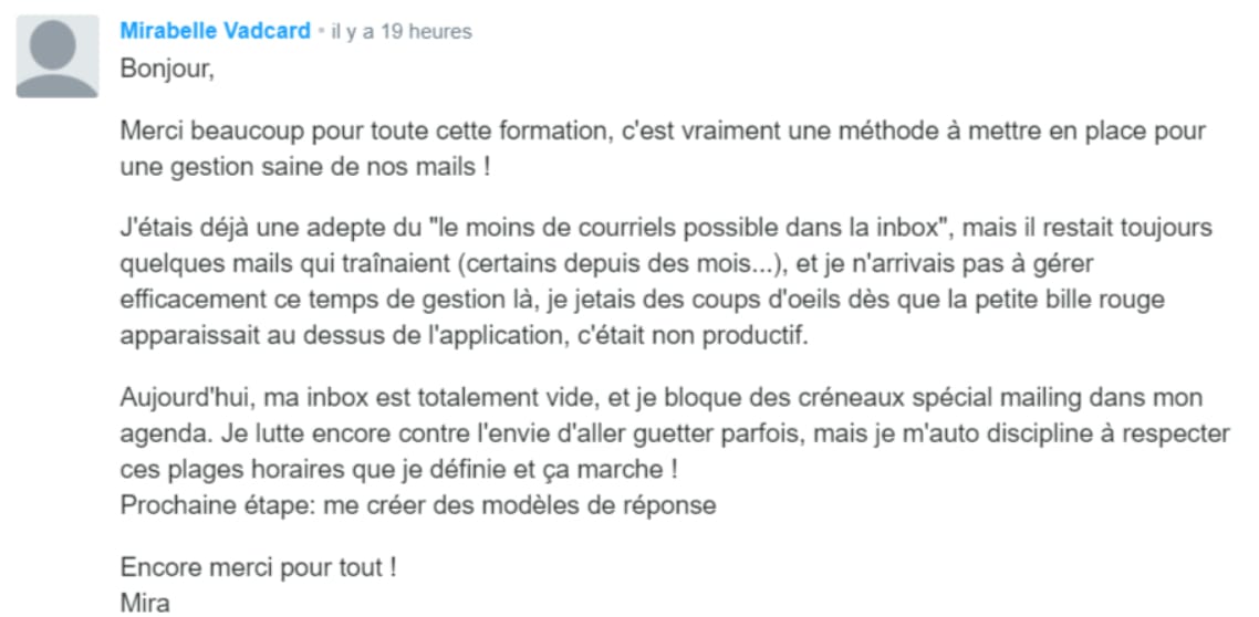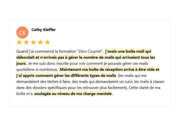 Dans cette formation, je t'enseigne le système exact que mes 3000 clients utilisent pour vider quotidiennement leur INBOX et couper de moitié le temps requis pour traiter leurs messages. 🎯